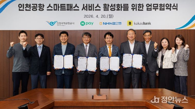 정안뉴스 안정주 기자 | 인천국제공항공사는 인천공항의 안면인식 출국 서비스인 ‘스마트패스’의 등록 채널을 확대하기 위해 네이버페이, NH농협은행, 카카오뱅크와 ‘스마트패스 서비스 활성화 업무협약’을 체결했다고 21일 밝혔다.