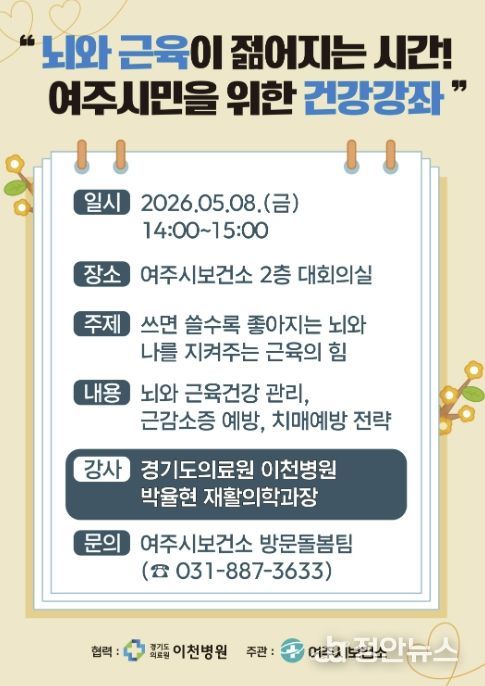 정안뉴스 안정주 기자 | 여주시보건소 건강증진과는 오는 5월 8일 오후 2시, 보건소 2층 대회의실에서 여주시민을 위한 건강강좌 '뇌와 근육이 젊어지는 시간!'을 개최한다고 밝혔다.