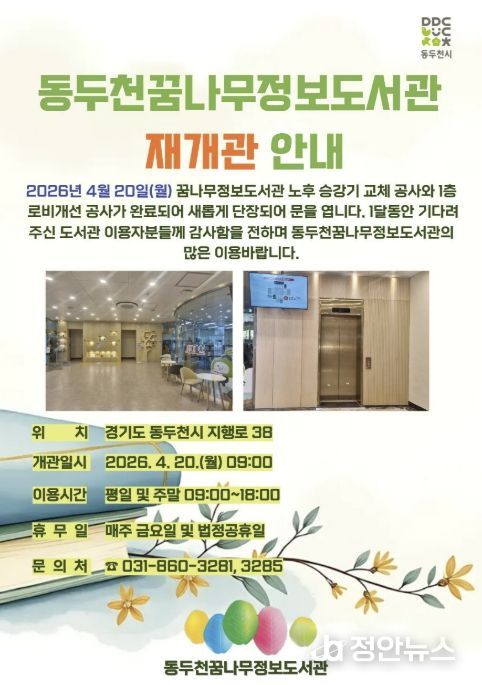 정안뉴스 안정주 기자 | 동두천시 도서문화사업소 꿈나무정보도서관은 이용자 편의성과 안전성 강화를 위한 승강기 교체 공사와 1층 로비 환경개선 공사를 마치고 지난 4월 20일부터 재개관했다고 밝혔다.