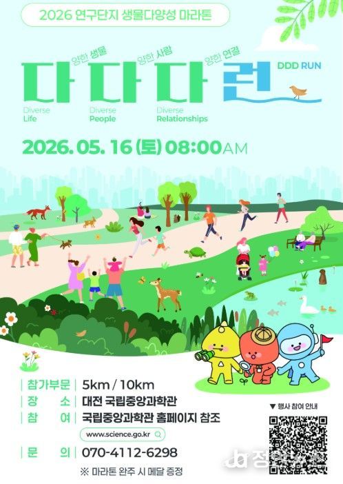 정안뉴스 안정주 기자 | 과학기술정보통신부 국립중앙과학관은 생물다양성의 소중함을 온몸으로 체감하고 일상 속 친환경 실천 문화를 확산하기 위한 2026 연구단지 생물다양성 마라톤 ‘다다다런(다양한 생물, 다양한 사람, 다양한 연결)’을 개최한다고 밝혔다.