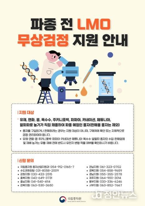 정안뉴스 안정주 기자 | 국립종자원은 농가에서 자가채종한 종자가 유전자변형생물체(LMO)인지 여부를 파종 전에 확인 할 수 있도록 연중 무상검정 신청을 접수 받는다.