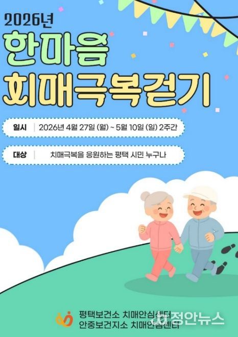 정안뉴스 안정주 기자 | 평택보건소 치매안심센터와 안중보건지소 치매안심센터에서는 지역 주민의 치매 예방과 인식개선을 위해 녪년 한마음 치매극복 걷기 행사’를 오는 4월 27일부터 5월 10일까지 2주간 진행한다.