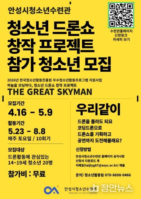 정안뉴스 안정주 기자 | 안성시청소년수련관은 미래 디지털 인재 양성을 위한 청소년 참여형 프로그램 '하늘을 코딩하다, 청소년 드론쇼 창작 프로젝트 ‘THE GREAT SKYMAN’'에 참여할 청소년을 4월 16일 ~ 5월 8일까지 모집한다고 밝혔다.