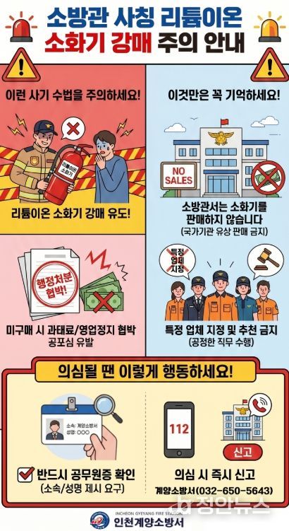정안뉴스 안정주 기자 | 계양소방서는 최근 소방공무원을 사칭해 리튬배터리용 소화기 등 물품 구매를 요구하는 사기 행위가 발생하고 있다며 시민들의 각별한 주의를 당부했다.