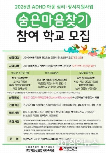 정안뉴스 안정주 기자 | 고양시일산종합사회복지관은 ADHD 아동의 학교 적응을 돕기 위한 심리·정서지원사업 ‘숨은마음찾기’에 참여할 학교를 모집한다고 21일 밝혔다.