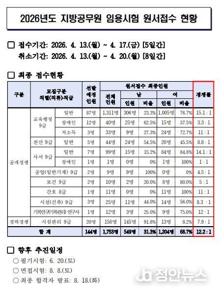정안뉴스 안정주 기자 | 부산광역시교육청은 지난 13일부터 17일까지 실시한 ‘2026년도 지방공무원 임용시험’ 원서접수 결과 144명 선발에 1,753명이 지원해 평균 12.2대 1의 경쟁률을 보였다고 밝혔다.