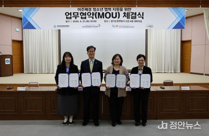 정안뉴스 안정주 기자 | 경기도미래세대재단은 21일 수원시 팔달구 옛 경기도청사에서 수원시글로벌청소년드림센터, 안산시글로벌청소년센터, 화성시글로벌청소년센터와 이주배경 청소년 지원을 위한 업무협약을 체결했다.