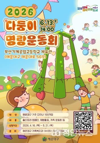 정안뉴스 안정주 기자 | 해운대구는 다자녀가정 우대 및 가족친화적 분위기 조성을 위해 '2026년 다둥이 명랑 운동회'에 참여할 다자녀가족 100가정을 모집한다.