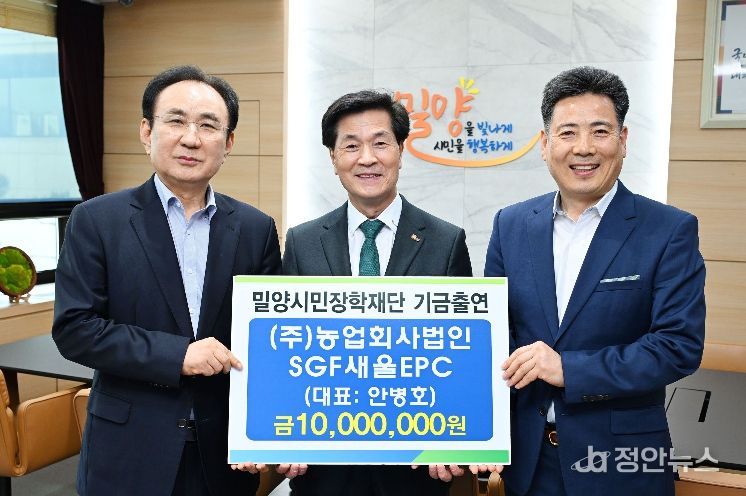 정안뉴스 김재홍 기자 | (재)밀양시민장학재단(이사장 안병구)은 21일 ㈜농업회사법인 SGF새울EPC(대표 안병호)로부터 지역 인재 육성을 위한 장학기금 1천만원을 기탁받았다고 밝혔다.