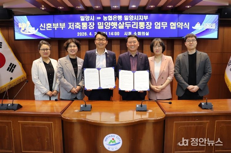 정안뉴스 김재홍 기자 | 경남 밀양시는 21일 시청 소회의실에서 농협은행 밀양시지부와 ‘밀양햇살두리통장 지원사업’의 원활한 추진을 위한 업무협약을 체결했다.