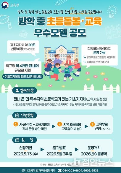 정안뉴스 안정주 기자 | 교육부는 4월 22일부터 5월 13일까지 2026년 방학 중 초등돌봄‧교육 우수모델을 운영할 기초지방자치단체 선정을 위한 공모를 실시한다.