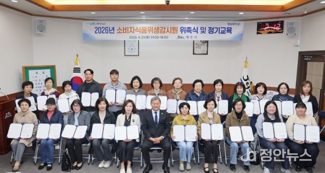 정안뉴스 안정주 기자 | 제주시는 어린이보호구역 등 지역 내 안전한 식품 환경 조성을 위해 4월 21일 시청 본관 회의실에서 소비자식품 위생감시원 위촉식을 개최했다.