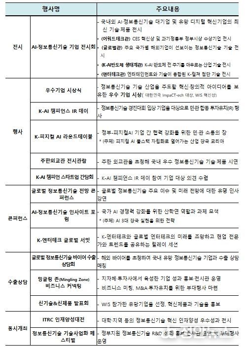 또한, 올해 처음으로 다양한 전문 프로그램도 운영된다. ‘인공지능·정보통신기술 통찰력 토론회(인사이트 포럼)’에서는 인공지능 3대 강국 도약을 위한 정책·기술 전략을 산·학·연 전문가들과 함께 논의하고, ‘한국형 물리적 인공지능 원탁회의(K-피지컬 AI 라운드테이블)’에서는 정부와 기업이 참여하여 산업 현장 중심의 물리적 인공지능(피지컬 AI) 기술 발전 방향과 협력 방안을 모색한다. 아울러, ‘한국형 융합 콘텐츠 기술 세계 정상회의(K-엔터테크 글로벌 서밋)’에서는 K-콘텐츠와 인공지능 기술의 융합 사례를 기반으로 세계 시장 진출 전략과 사업 모델을 공유할 예정이다.