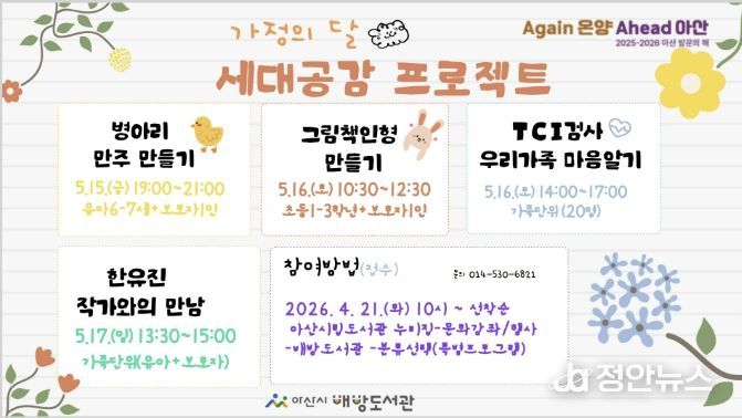 정안뉴스 안정주 기자 | 아산시 배방도서관이 5월 가정의 달을 맞아 가족 간 소통과 유대감 강화를 위한 ‘세대공감 프로젝트’를 운영한다.