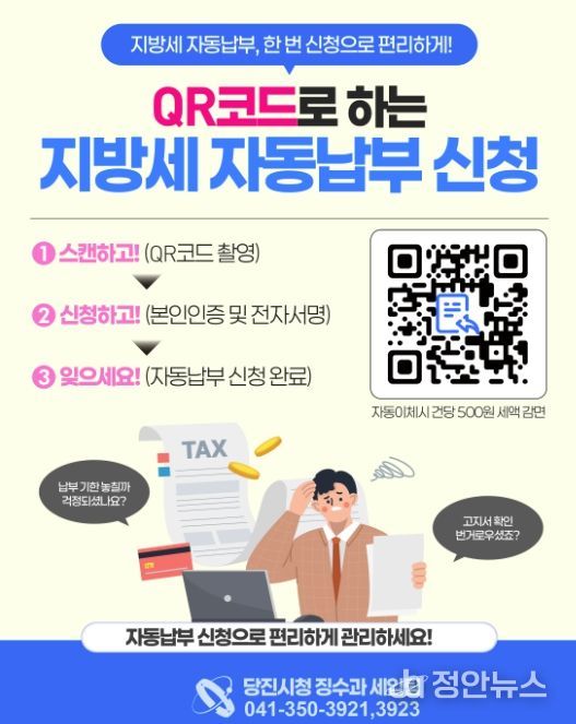 정안뉴스 안정주 기자 | 당진시가 전국 지방자치단체 최초로 스마트폰을 활용한 ‘QR 자동납부 신청 시스템’을 본격 도입하며 디지털 세무 행정의 문턱을 대폭 낮췄다.