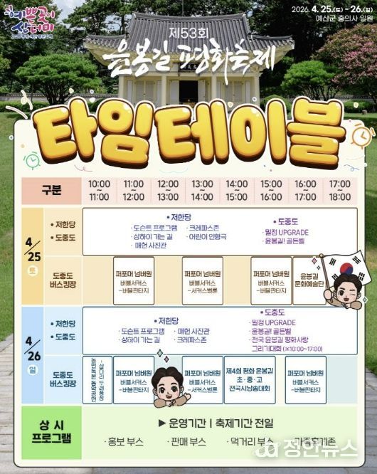 정안뉴스 안정주 기자 | 예산군은 ‘제53회 윤봉길 평화축제’를 오는 4월 25일부터 26일까지 덕산면 충의사 일원에서 개최한다고 밝혔다.