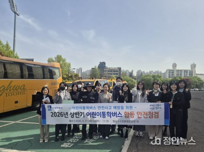 정안뉴스 안정주 기자 | 수원특례시는 21일 수원종합운동장 주차구역에서 수원 장안·권선·팔달·영통경찰서, 한국교통안전공단과 함께 ‘2026년 상반기 어린이통학버스 합동 안전점검’을 했다.