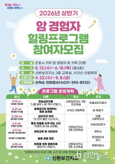 정안뉴스 안정주 기자 | 군포시 산본보건지소는 오는 5월 13일부터 6월 18일까지 총 6회에 걸쳐 암 경험자와 그 가족 20여 명을 대상으로 암 경험자 자조모임인 ‘봄·봄·봄 프로그램’을 운영한다.