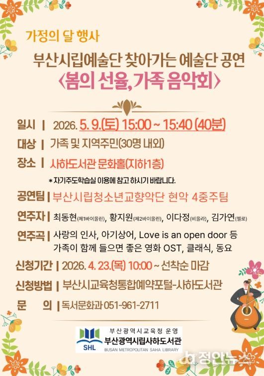 정안뉴스 안정주 기자 | 부산광역시립사하도서관은 가정의 달을 맞아 다음달 9일 오후 3시 도서관 문화홀에서 지역주민 30명을 대상으로 부산시립예술단 찾아가는 예술단 공연 ‘봄의 선율, 가족 음악회’를 개최한다.