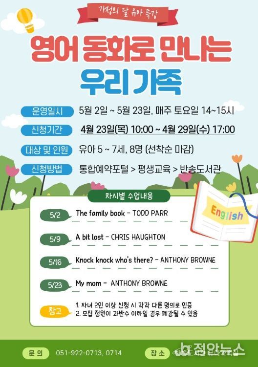 정안뉴스 안정주 기자 | 부산광역시립반송도서관은 다음달 2일부터 23일까지 매주 토요일마다 도서관 유아가족실에서 5~7세 유아 8명을 대상으로 가정의 달 유아 특강 ‘영어 동화로 만나는 우리 가족’을 운영한다.