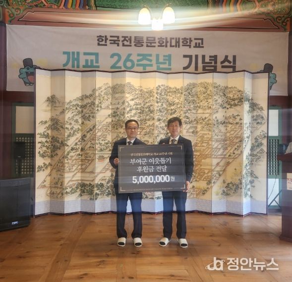 정안뉴스 안정주 기자 | 한국전통문화대학교 교직원일동은 개교 26주년 기념행사에서 저소득 가구의 초·중·고 학생 장학금으로 사용해 달라며 이웃돕기 성금 500만 원을 부여군에 기탁했다고 22일 밝혔다.