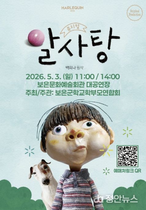 어린이주간 기념 가족 뮤지컬 ‘알사탕’ 공연은 5월 3일 오전 11시와 오후 2시 보은문화예술회관에서 열린다. 백희나 작가의 동명 그림책을 원작으로 한 따뜻한 성장 이야기를 담았다. 관람은 무료이며 티켓링크를 통한 사전 예매로 진행된다.