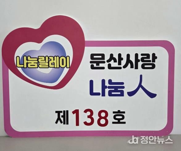 정안뉴스 안정주 기자 | 문산면 문산사랑후원회는 지난 20일 지역 내 어려운 이웃을 위해 100만 원을 기탁한 ㈜명문건설 나도운 대표를 ‘문산사랑나눔인’ 138호로 선정했다.