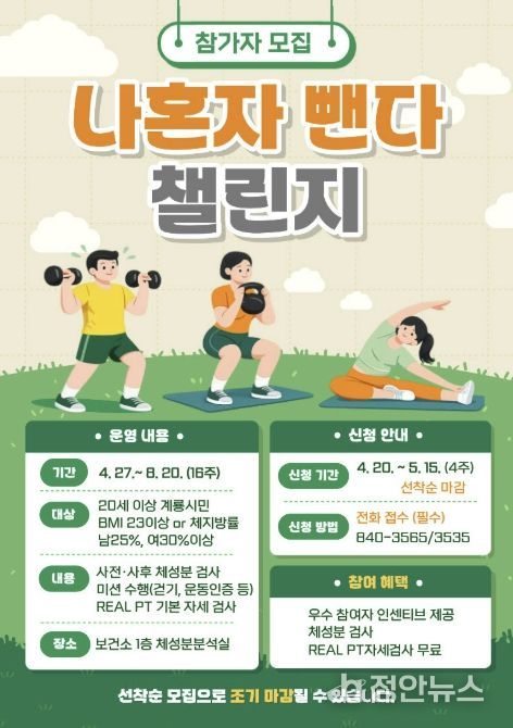 정안뉴스 안정주 기자 | 충남 계룡시는 시민들의 건강한 체중 감량과 올바른 운동 습관 형성을 위해 오는 5월 15일까지 ‘나혼자 뺀다’ 챌린지 참여자 300명을 선착순으로 모집한다고 밝혔다.