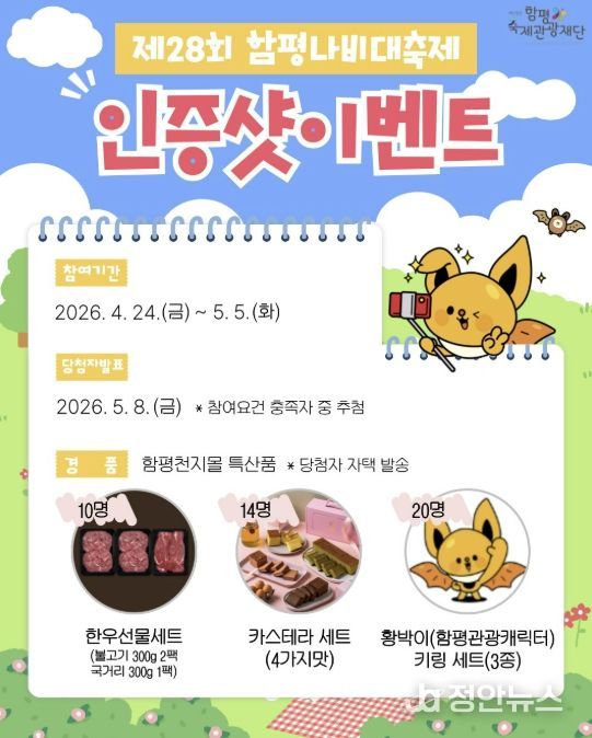 정안뉴스 안정주 기자 | 전남 함평군이 제28회 함평나비대축제를 맞아 축제의 생생한 현장 분위기를 알리고 관람객의 참여를 확대하기 위해 SNS 인증 이벤트를 진행한다.