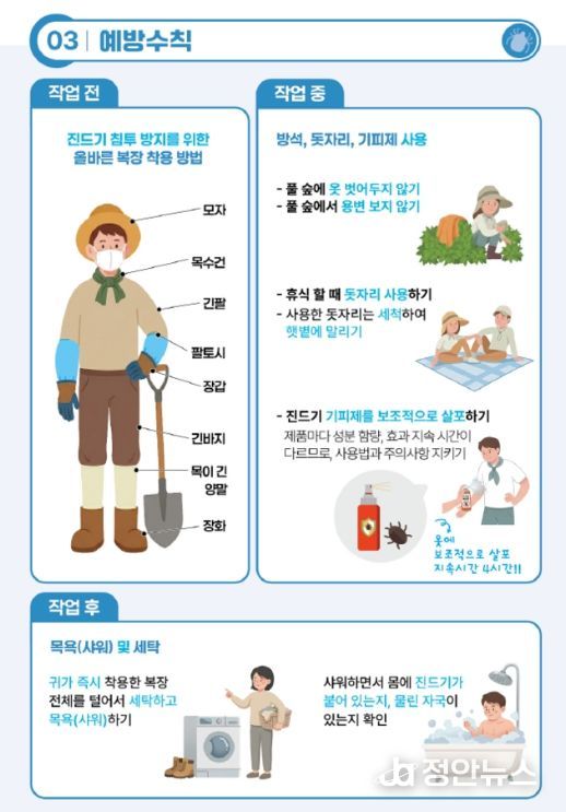 작업 중 진드기 접촉을 피하기 위한 생활 수칙 준수도 중요하다.