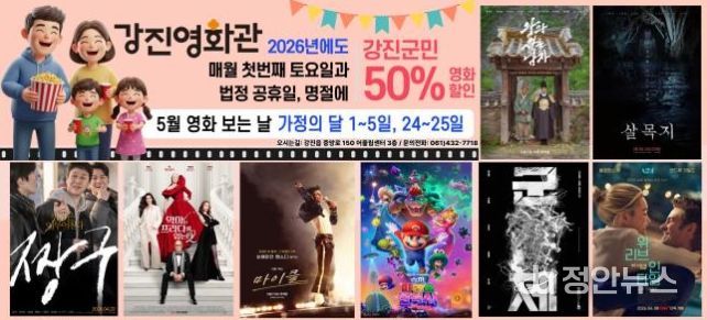 정안뉴스 안정주 기자 | 강진군이 가정의 달 5월을 맞아 강진영화관 ‘영화 보는 날’ 행사를 운영한다.