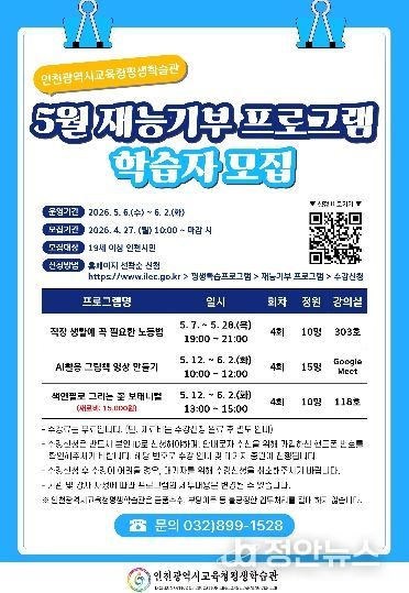 정안뉴스 안정주 기자 | 인천광역시교육청평생학습관은 오는 27일부터 시민의 재능을 나누는 ‘재능기부 프로그램’ 학습자를 모집한다.