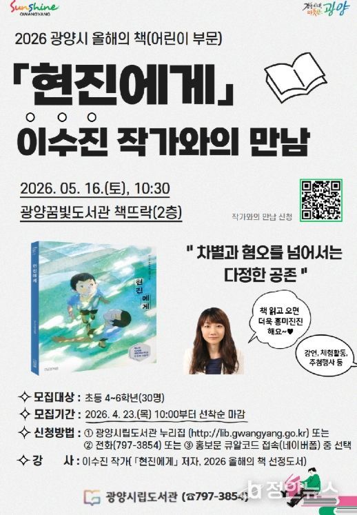 정안뉴스 안정주 기자 | 광양시는 오는 5월 16일 오전 10시 30분 꿈빛도서관에서 ‘2026년 올해의 책’ 어린이 부문 선정 도서'현진에게'의 저자 이수진 작가를 초청해 강연을 연다고 밝혔다.
