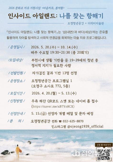 정안뉴스 안정주 기자 | 부천시는 오정청년공간에서 정서적 고립감을 겪는 청년을 위한 미술 치유 프로그램 ‘인사이드 아일랜드: 나를 찾는 항해기’ 참여자를 5월 13일까지 모집한다.