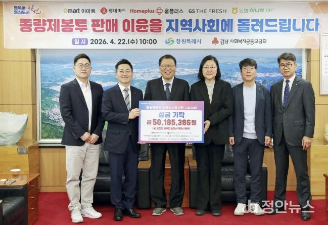 정안뉴스 김재홍 기자 | 창원특례시는 22일 시청 접견실에서 관내 대형유통업체 16개소가 참여한 『종량제봉투 판매이윤 나눔사업』 성금(5,018만원) 기탁식을 개최했다고 밝혔다.