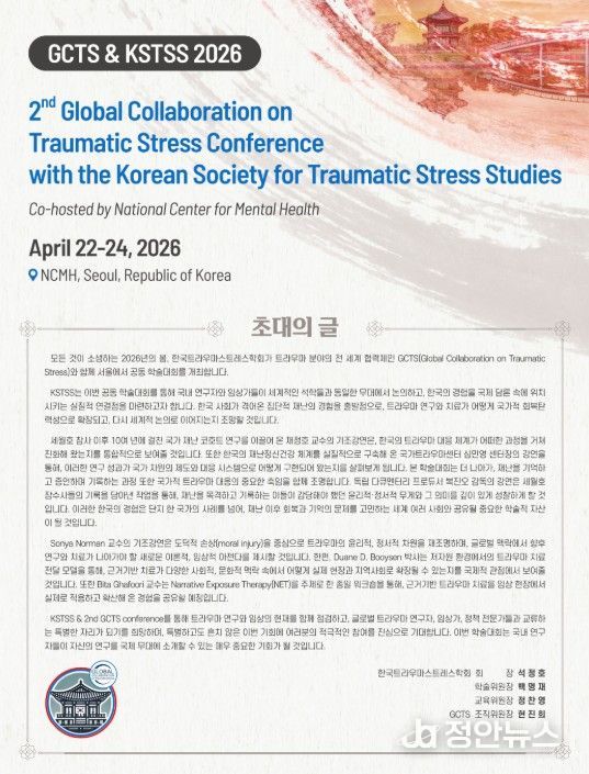 이번 학술대회는 글로벌 트라우마 스트레스 협의체 (GCTS)와 한국트라우마스트레스학회(KSTSS), 국립정신건강센터가 공동 주최하는 행사로, 외상 후 스트레스, 재난 정신건강, 근거기반 치료 확산, 지역사회 회복, 국제협력 방안 등을 논의한다.