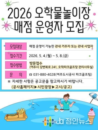 정안뉴스 안정주 기자 | 여주도시공사는 2026년 오학물놀이장 운영을 앞두고 이용객 편의 제공을 위한 매점 운영자를 공개 모집한다고 밝혔다.