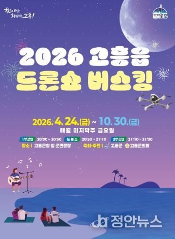 정안뉴스 안정주 기자 | 고흥군은 ‘2026 고흥읍 드론쇼 버스킹 공연’을 오는 4월 24일부터 10월 24일까지 7개월간 매월 마지막 주 금요일 고흥군청 앞 군민광장에서 개최한다고 밝혔다.