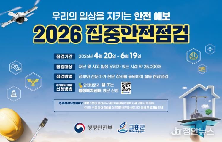 정안뉴스 안정주 기자 | 고흥군은 재난과 안전사고 예방을 위해 4월 20일부터 6월 19일까지 2개월간 ‘2026년 집중안전점검’을 실시한다고 밝혔다.