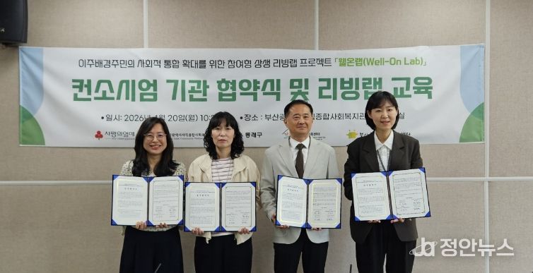 정안뉴스 안정주 기자 | 부산 동래구는 사직종합사회복지관(관장 황승호)이 지난 20일 이주배경주민의 사회적 통합 확대를 위한 소셜리빙랩 프로젝트 ‘웰온랩(Well-on Lab)’의 성공적인 추진을 위해 동래구청 및 유관 기관과 업무협약을 체결했다고 밝혔다.