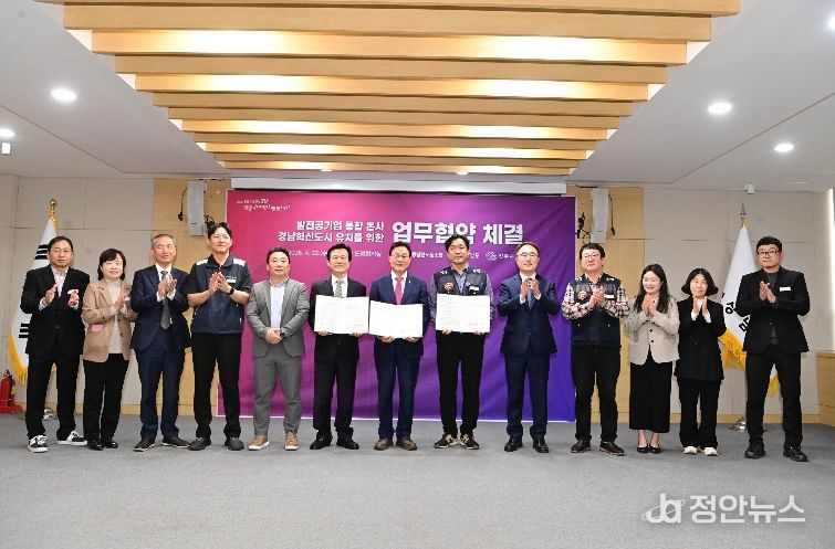 정안뉴스 김재홍 기자 | 진주시는 경상남도, 한국남동발전㈜ 노조와 함께 22일 발전공기업 통합 본사의 경남진주 혁신도시 유치를 위한 업무협약(MOU)을 체결했다고 밝혔다.