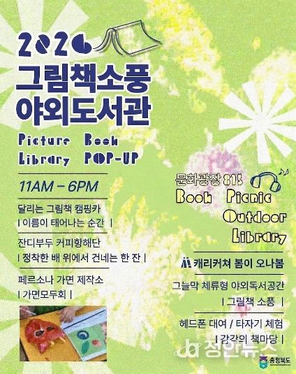 정안뉴스 안정주 기자 | 충북도가 4월 25일부터 26일까지 이틀간 도청 문화광장 815에서 온 가족이 함께 즐기는 ‘충북야외도서관 '그림책 소풍'’ 행사를 개최한다.