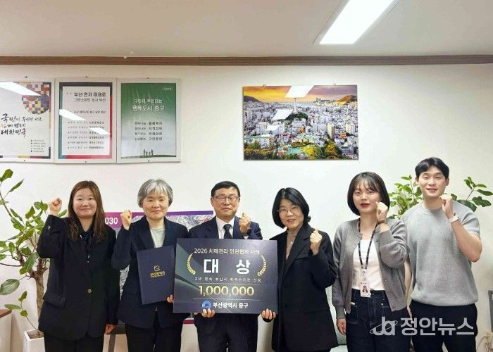 정안뉴스 안정주 기자 | 부산 중구는 2026년 치매관리 민관협력 우수사례 공모전에서‘소지역 맞춤형 기억동행, 중구형 치매보듬마을’사례로 대상을 수상했다고 밝혔다.