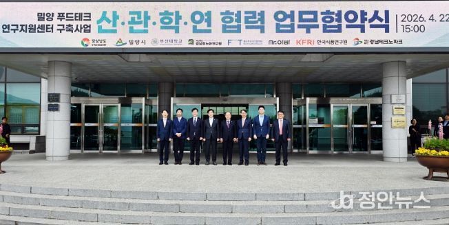 정안뉴스 김재홍 기자 | 경상남도는 22일 밀양시청에서 ‘밀양 푸드테크 연구지원센터 구축’을 위한 산·관·학·연 협력 업무협약(MOU)을 체결하고, 농림축산식품부가 추진하는 105억 원 규모의 ‘푸드테크 연구지원센터 구축사업(스마트유통 분야)’ 공모 준비에 본격 착수했다.