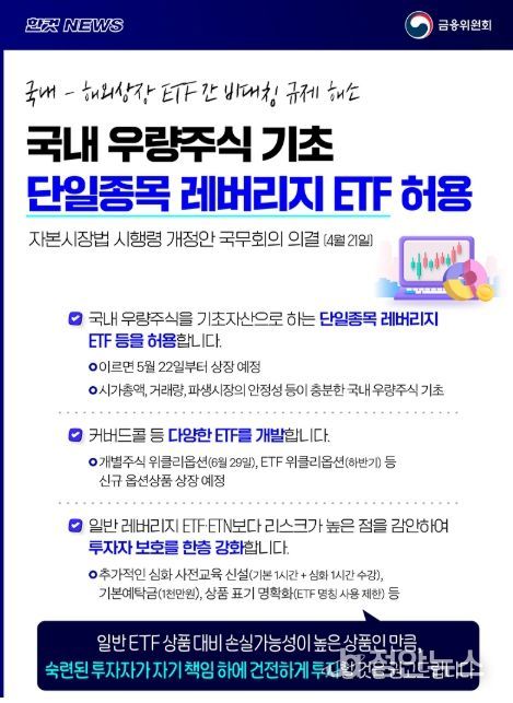 · 국내 우량주식을 기초자산으로 하는 단일종목 레버리지 ETF 등을 허용합니다.