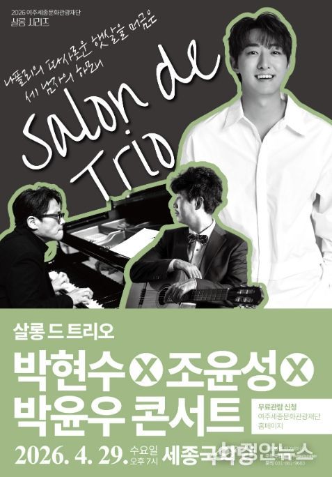 정안뉴스 안정주 기자 | 여주세종문화관광재단이 오는 29일, 문화가 있는 날을 맞아 2026년 특별기획 살롱 시리즈의 세 번째 무대 '살롱 드 트리오 박현수X조윤성X박윤우 콘서트'를 세종국악당에서 개최한다.