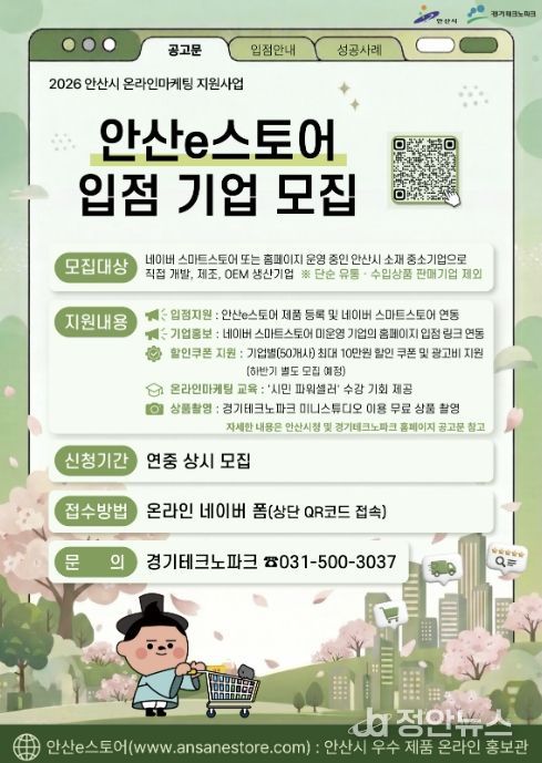 정안뉴스 안정주 기자 | 안산시는 관내 중소기업의 판로 확대와 홍보 강화를 위해 안산시 우수 제품 온라인 홍보관 ‘안산e스토어’에 신규 입점할 기업을 모집한다고 23일 밝혔다.