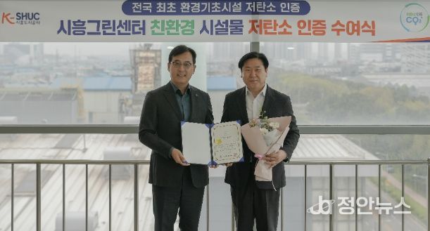 정안뉴스 안정주 기자 | 시흥도시공사는 지난 4월 21일 도시재생안전협회로부터 시흥그린센터 ‘친환경 시설물 저탄소’ 인증을 획득하고 인증식을 진행했다고 밝혔다. 이번 성과는 기관 단위가 아닌, 전국 환경기초시설 중 최초로 ‘시설물 단위 사업장’의 저탄소 인증을 받은 사례로, 환경 분야의 새로운 이정표를 세웠다는 평가를 받고 있다.