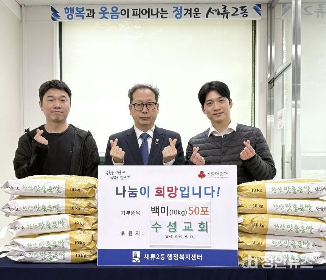 정안뉴스 안정주 기자 | 지난 22일, 수원시 권선구 세류동에 소재한 수성교회는 백미 500kg을 세류2동 행정복지센터에 전달했다.