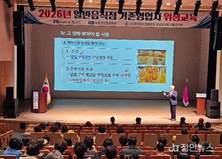 정안뉴스 김재홍 기자 | 의령군은 22일 의령군민문화회관에서 일반음식점 기존 영업자 300여 명을 대상으로 위생교육을 실시했다고 밝혔다.